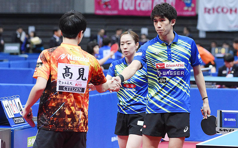 天皇杯・皇后杯 平成30年度 全日本卓球選手権大会<丸善インテックアリーナ大阪 1月14日(月)~20日(日)開催>大会2日目の15日、混合ダブルス3回戦で世界卓球2017金メダルペアの吉村真晴(名古屋ダイハツ)・石川佳純(全農)組が高見真己・船本さくら(ともに愛知工業大)に1-3で敗れた。