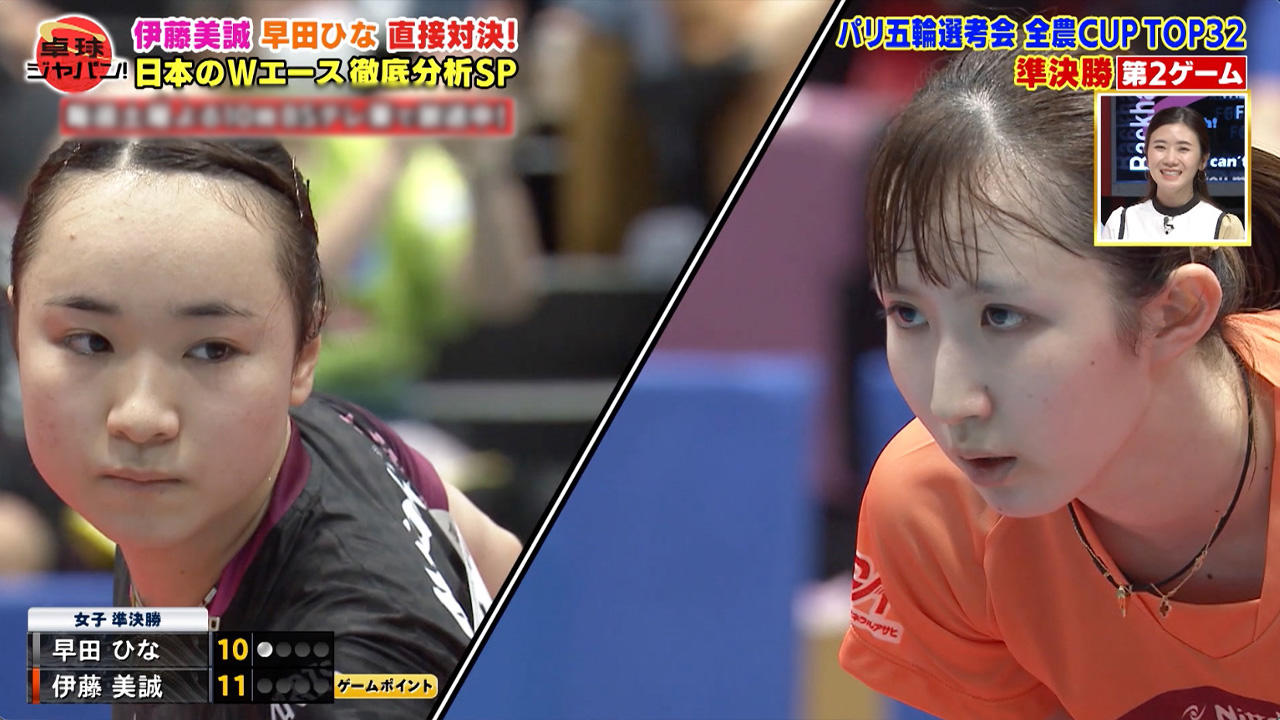 11月5日放送の『卓球ジャパン!』は、9月に行われた第2回パリ五輪日本代表選考会 全農CUP TOP32の準決勝、伊藤美誠(スターツ)対早田ひな(日本生命)の一戦をピックアップ。