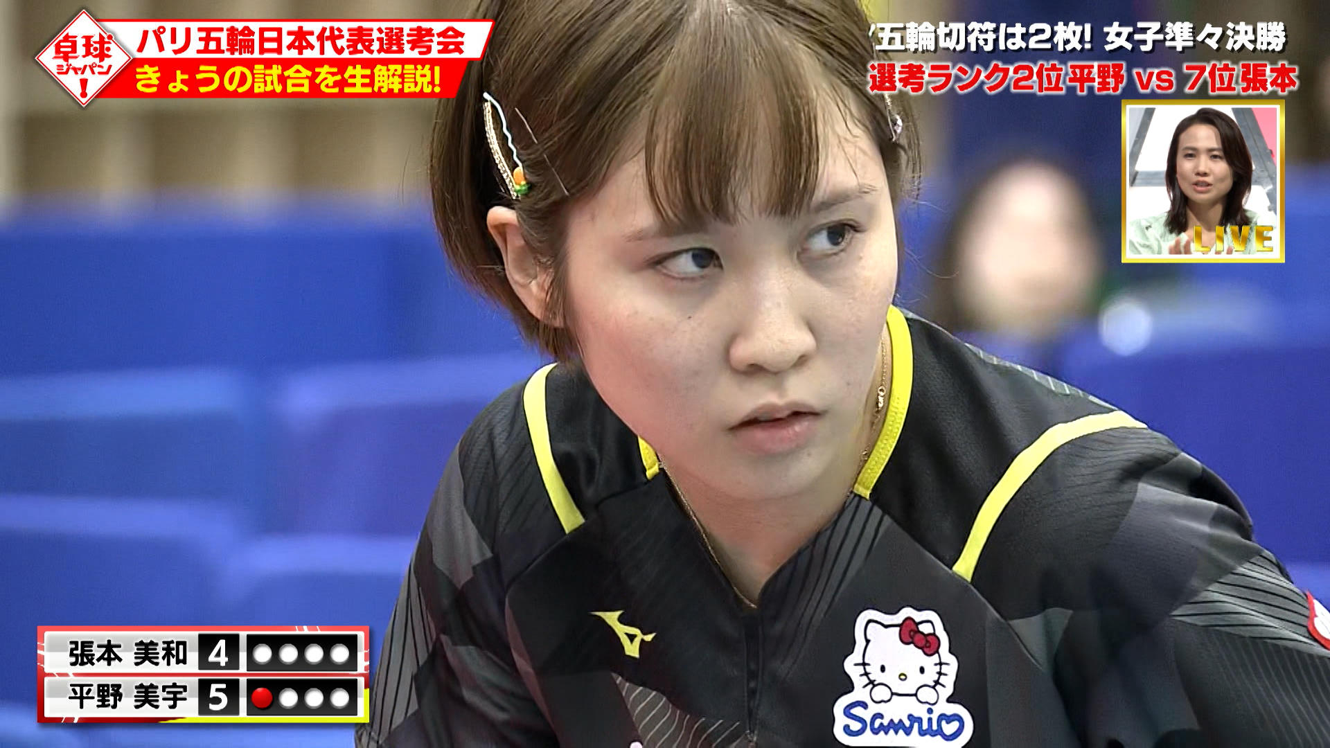7月22日の『卓球ジャパン!』は、生放送で第5回パリ五輪日本代表選考会の熱戦をDEEP解説。女子準々決勝の平野美宇(木下グループ)対張本美和(木下アカデミー)、男子準々決勝の張本智和(智和企画)対宇田幸矢(明治大学)の2戦を分析した。