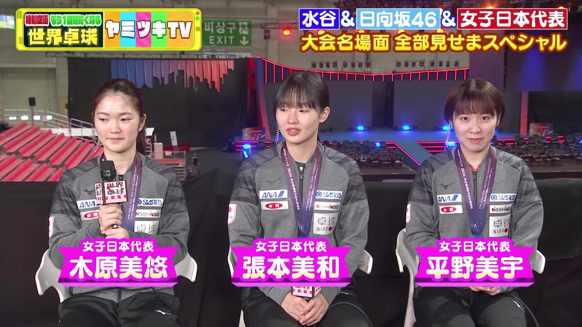 ひなが、美宇が、美誠が...ライバルとして熾烈なシングルス代表のサバイバルを終え強くなった個が、今度は最強のチームメートとして日の丸のもと、1つに...そして15歳張本美和は世界卓球デビュー戦!チームニッポン結束、パリオリンピック、そして、金メダルへ!