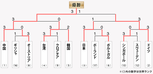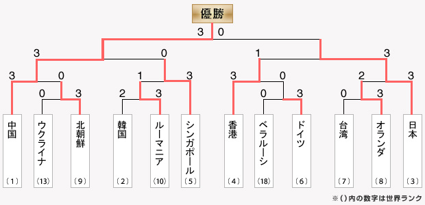 | 国名(世界ランク) | JPN | TPE | HUN | BLR | USA | AUS | 勝 | 負 | 勝点 | 順位 |