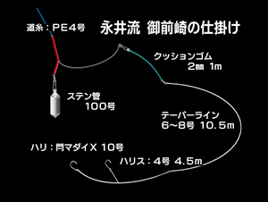 (使用したタックル) (ロッド)カイコウ60 285+B (永井) カイコウ40 255+B (芝) (リール) NEW電動丸1000スペシャル(永井・芝) (エ サ) エビ 【御前崎の仕掛け】 道糸:PE4号/ステン管100号/クッションゴム2mm1m / テーパーライン6~8号10.5m ハリス:4号4.5m/ハリ:閂マダイX10号 (その他) 探見丸システム