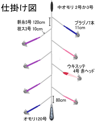 中オモリ2号か3号/プラヅノ7本11cm/幹糸5号120cm/枝ス3号10cm