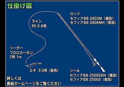 [ 使用したタックル ] 〈 ロッド 〉 セフィアBB S803M ( 堀田 ) セフィアBB S806MH ( 安田 ) 〈 リール 〉 セフィアBB 2500SDH ( 堀田 ) セフィアBB 2500S ( 安田 ) 【仕掛け図】 ライン:PE0.8号/リーダー:フロロカーボン2号1m/エギ:3.5号(各色)