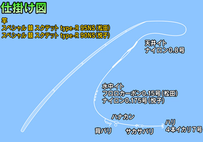 [ 使用したタックル ] 〈 竿 〉 スペシャル 競 スクデット type-R 95NS ( 松田 ) スペシャル 競 スクデット type-R 90NS ( 悦子 ) 【仕掛け図】 天井イト:ナイロン0.8号 水中イト:フロロカーボン0.15号(松田)・ナイロン0.175号(悦子) /ハナカン/背バリ/サカサバリ/ハリ:4本イカリ7号