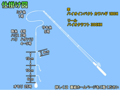 [ 使用したタックル ] 〈 ロッド 〉 バイオインパクト カワハギ180H 〈 リール 〉 バイオクラフト 300XH 〈 その他 〉 探見丸システム 【仕掛け図】 ミチ糸:1号/幹糸:4号/ハリス:3号 /ハリ:ハゲバリ4-5号/オモリ:25号/サキ糸:5号