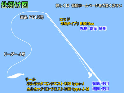 [ 使用したタックル ] 〈 ロッド 〉 ゲームtype J B600ss ( 児島・増岡 ) 〈 リール 〉 カルカッタコンクエスト 300 type J ( 児島 ) カルカッタコンクエスト 300 type J-M ( 増岡 ) 〈 その他 〉 探見丸システム 【仕掛け図】 道糸:PE1.5号/リーダー:4号