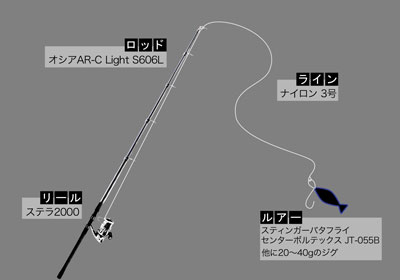 [ 使用したタックル ] 〈 ロッド 〉 オシアAR-C Light S606L 【仕掛け図】 〈 ロッド 〉オシアAR-C Light S606L 〈 リ-ル 〉ステラ2000 〈 ライン 〉ナイロン 3号 〈 ルアー 〉スティンガーバタフライ センターボルテックス JT-055B