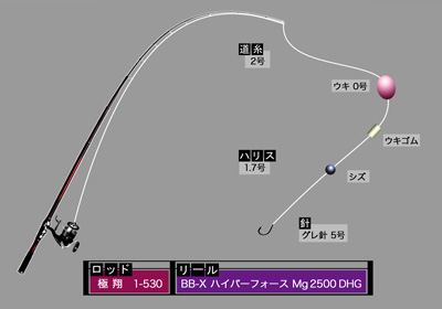[ 使用したタックル《高野》 ] 〈 ロッド 〉極翔 1-530 〈 リ-ル 〉BB-Xハイパーフォース MG2500DHG 【仕掛け図】 〈 ロッド 〉極翔 1-530 〈 リ-ル 〉BB-Xハイパーフォース MG2500DHG 道糸 2号 ウキ 0号 ハリス1.7号 ウキゴム シズ グレ針5号