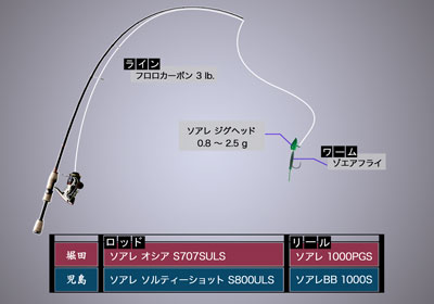 【使用タックル(堀田)】 〈 ロッド 〉 ソアレ オシア S707SULS 〈 リール 〉 ソアレ 1000PGS 【使用タックル(児島)】 〈 ロッド 〉 ソアレ ソルティーショット S800ULS 〈 リール 〉 ソアレ BB 1000S 【仕掛け】 ライン フロロカーボン 3lb ソアレ ジグヘッド 0.8~2.5g ワーム ゾエアフライ