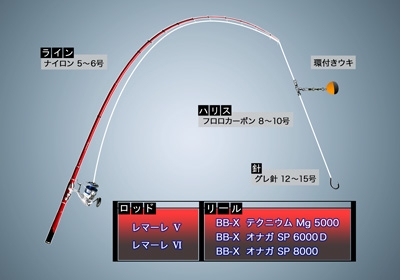 【使用タックル(高橋)】 〈 ロッド 〉 レマーレ V レマーレ VI 〈 リール 〉 BB-X テクニウム Mg 5000 BB-X オナガ SP 6000 D BB-X オナガ SP 8000 【仕掛け】 ライン ナイロン 5~6号 環付きウキ ハリス フロロカーボン 8~10号 針 グレ針 12~15号