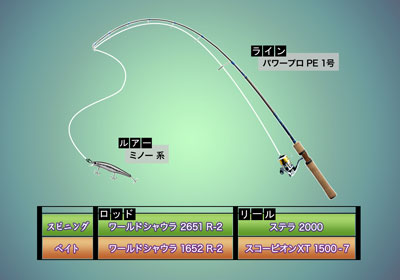 【使用タックル】 *スピニング* 〈 ロッド 〉 ワールドシャウラ 2651 R-2 〈 リール 〉 ステラ 2000 *ベイト* 〈 ロッド 〉 ワールドシャウラ 1652 R-2 〈 リール 〉 スコーピオン XT 1500-7 【仕掛け】 ライン パワープロ PE 1号 ルアー ミノー系