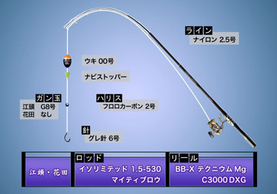 【仕掛け】 ナイロン 2.5号 ウキ 00号 ナビストッパー ハリス フロロカーボン2号 ガン玉 江頭・G8号 花田・なし 針 グレ針 6号