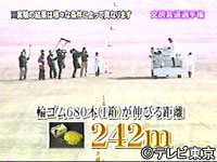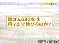 輪ゴム1箱(100g)に入っている、680本の輪ゴムをすべてつなぎ合わせて1本にし、どれだけ伸びるかに挑戦。その距離を予想する。距離は、輪ゴムが切れたところとする。