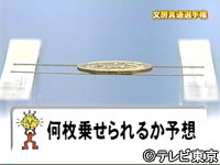橋渡しした2本のシャープペンの芯の上に、10円玉が何枚乗るかを予想する。10円玉1枚の重さは、約4.5g。シャープペンの芯は、どれだけの重さに耐えられるのか。